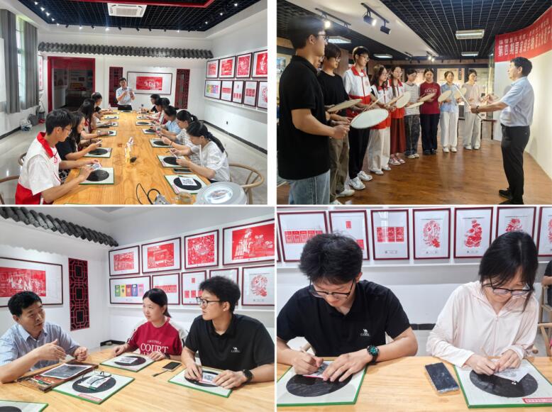 圖1沉浸體驗,感受非遺魅力。實踐團成員在非遺傳承人張仁高老師的指導下,于動手實踐和親耳聆聽中感受非遺魅力??碳堊狼埃蓡T們屏息凝神,執起刻刀,于方寸紙間游走,“柿柿如意”的紋樣逐漸躍然紙上;親手觸摸鼓面,學習擊打節奏,嘗試模仿韻味悠長的唱段。“一刀一刻、一鼓一韻,親身體驗后才真正懂得何為匠心,也更深刻理解了張老師‘讓文化在年輕人手中傳承下去’的執著信念”。團隊負責人李欣芯說道。