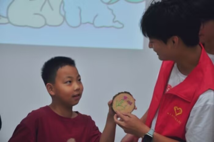 活動尾聲,志愿者們為積極參與和表現優秀的孩子們送上了精心準備的小禮物。孩子們如獲至寶般捧著自己創作的圓木片合影留念,純真的笑容與收獲的喜悅,共同定格為這個夏日的珍貴回憶。