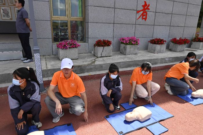 在東鄉民族中學,實踐隊邀請甘肅省紅十字會開展專題宣講。甘肅省紅十字會郭愛軍老師通過情景模擬、互動問答和實踐操作等方式,向400余名師生普及心肺復蘇、海姆立克急救法、創傷包扎等實用技能。初二學生馬路遙在實操環節中,在隊員指導下完成胸外按壓模擬,他感慨:“以前覺得急救離我們很遠,現在知道關鍵時刻能救人一命!”