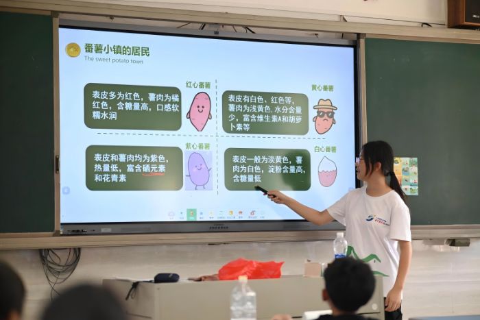 活動中,“海邊紅透”團隊依托“山海育禾”團隊的課程資源,向學生們細致講解了番薯漂洋過海的歷史、不同品種(如甜糯型、粉面型)的分類,以及發芽番薯等不可食用類型的識別等。課程末尾,以搶答領獎、三人握筆游戲的互動形式,加深同學們對知識的印象,兩支隊伍成員積極協助,孩子們踴躍參與。