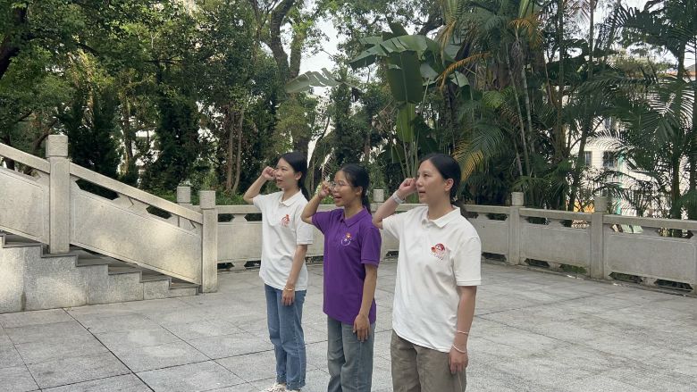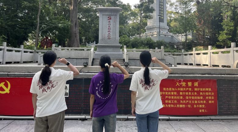 接著,團隊踏入中越人民友誼公園,穿過湖上的拱橋和中越邊防部隊友誼林,來到東興支部成立紀念碑前。東興支部紀念碑不僅是一段歷史的見證,更是邊境地區黨員干部進行黨性教育的重要基地。透過石碑,隊員們深切了解到,先輩鐘竹筠曾在風雨飄搖的年代,以無畏的勇氣沖破重重阻礙,在邊境大地播撒革命真理的火種。而作為后輩,隊員們從這份厚重的歷史中讀懂了“初心”的分量,在學習中堅定理想信念,在實踐中踐行“為人民服務”的宗旨,讓紅色基因在接力中代代相傳?,F場,黨員同志們整齊列隊,面向紀念碑莊嚴舉起右拳,進行入黨宣誓,鏗鏘誓言回蕩在公園上空,既是對革命先輩的告慰,也是對初心使命的鄭重承諾。