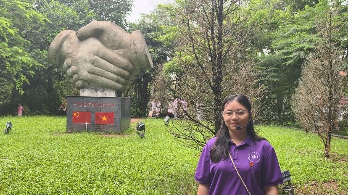 友誼林中,兩只緊握的大手雕塑靜靜佇立,底座上中越兩國國旗交相輝映。青年們以“樹”為喻:“這片樹林里的每一棵樹,都像兩國邊防部隊的情誼,根連根、肩并肩。正是這種緊密合作,才筑牢了邊境安全的屏障,守護了我們今天的和平生活。”枝葉婆娑間,宣講聲與風聲交織,仿佛在續寫新時代的友誼篇章。