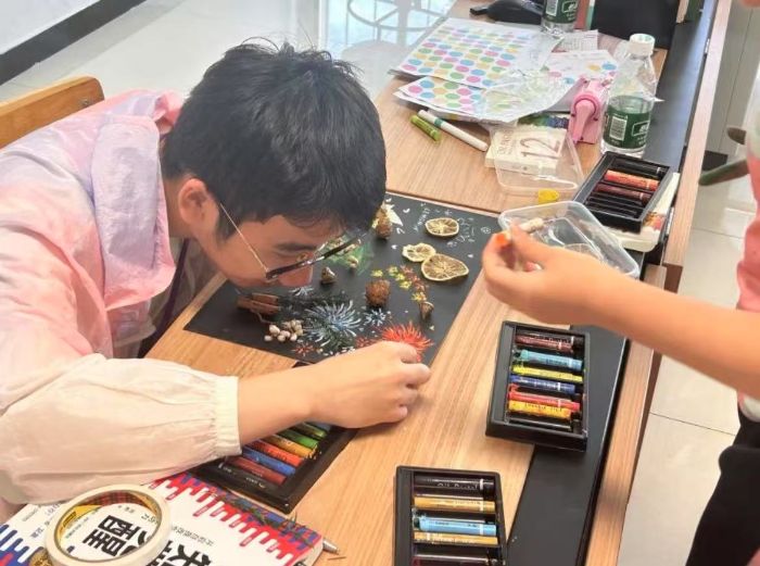 7月14日下午,寧波軌道交通職工子女暑期公益托管班的美育主題課程正式開啟?;顒蝇F場,色彩斑斕的繪畫工具、形態各異的干花材料以及琳瑯滿目的手工用品整齊擺放,吸引了孩子們好奇的目光。志愿老師向孩子們介紹了今天的課程安排,并鼓勵大家大膽想象、勇敢創作。“藝術沒有對錯,重要的是享受創作的過程。”老師的話讓孩子們放松下來,滿懷著對美的追求與期待,躍躍欲試地準備開啟他們的藝術之旅。