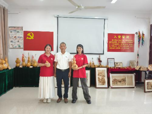 下午5點(diǎn),顧秀國戴著眼鏡,捧著一個(gè)大葫蘆,用烙畫機(jī)一點(diǎn)一點(diǎn)的描摹著葫蘆上畫的葉子的邊,再用更輕的力度去渲染面,機(jī)器運(yùn)行的輕微嗡嗡聲和頭頂風(fēng)扇的轉(zhuǎn)動(dòng)摩擦聲在安靜的房間里分外明顯。這是隊(duì)員們見到葫蘆烙畫傳承人顧秀國的第一個(gè)畫面。采訪者袁心悅問,“烙畫最關(guān)鍵的是什么?”傳承人顧秀國毫不猶豫的回答:“那肯定是愛好!”據(jù)傳承人顧秀國分享,他從小喜愛繪畫,在參軍時(shí)期更是抽出業(yè)余時(shí)間來學(xué)習(xí)食品烙畫。而烙鐵接觸葫蘆的三秒內(nèi)屏息才能控制碳化程度,這比毛筆提按難十倍,若不是真心喜愛很少人有耐心堅(jiān)持下去。烙鐵溫度從低到高接觸葫蘆會(huì)呈現(xiàn)由焦黃到赭石再到墨黑的顏色變化。顧秀國一年前來到玉皇村擔(dān)任第一書記,就選擇了葫蘆烙畫來進(jìn)行鄉(xiāng)村振興。傳承人顧秀國開辦了非遺葫蘆烙畫課堂,以留守老人為教學(xué)對(duì)象,并讓大家利用周圍的閑置土地來種植葫蘆,用烙畫提高葫蘆的經(jīng)濟(jì)價(jià)值,助力玉皇村的鄉(xiāng)村振興。問到之前辦過關(guān)于雷鋒精神的活動(dòng)時(shí),采訪者袁心悅詢問平時(shí)有什么踐行雷鋒精神的行為。傳承人顧秀國笑著說表示每周天都會(huì)去敬老院打掃衛(wèi)生,已經(jīng)堅(jiān)持一年了。