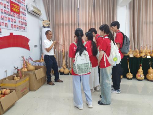 在傳承人顧秀國的工作室和展覽室中,隊(duì)員們觀察到葫蘆烙畫上的內(nèi)容不僅有傳統(tǒng)的花鳥魚蟲,還有新潮的動(dòng)畫人物,比如電影《魔童降世》中的哪吒,還有近期火爆的玩偶labubu。傳承人顧秀國表示,葫蘆烙畫的內(nèi)容在傳承古畫的同時(shí),也會(huì)實(shí)時(shí)關(guān)注社會(huì)動(dòng)向與需求,為購買者提供個(gè)人定制服務(wù),讓非遺技藝在傳承的基礎(chǔ)上更好的與社會(huì)融合。葫蘆烙畫的形式也是多種多樣的。既有純葫蘆烙畫,也有彩色畫,雕刻畫,還有精美的掐絲工藝,漆面葫蘆畫。在介紹展覽室里的葫蘆烙畫作品時(shí),大家觀察到有幾個(gè)大葫蘆形狀“崎嶇”,有一個(gè)葫蘆柄上自然的打著一個(gè)結(jié),或者兩個(gè)葫蘆一起打結(jié),甚至還有三個(gè)一起的。傳承人顧秀國解釋道,這些特殊的葫蘆形狀是在葫蘆小的時(shí)候人為塑形的。他還分享了一個(gè)要去的知識(shí),葫蘆塑型一定要在下午,下午時(shí)葫蘆是軟的,才方便塑形,但如果是上午,那是葫蘆是脆的,一掰就斷了。說到這些細(xì)節(jié)時(shí),傳承人顧秀國口若懸河,對(duì)制作葫蘆烙畫的過程如數(shù)家珍,神采奕奕的向大家介紹,時(shí)不時(shí)望向窗外的葫蘆地,眼神中滿滿是對(duì)葫蘆的驕傲。