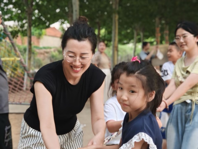 下午,活動(dòng)轉(zhuǎn)移至戶外。支教隊(duì)員預(yù)先規(guī)劃區(qū)域并設(shè)置游戲項(xiàng)目。在“一二三木頭人”游戲中,擔(dān)任裁判的隊(duì)員發(fā)出指令,參與的學(xué)生迅速定格姿勢(shì),保持靜止?fàn)顟B(tài),部分學(xué)生因微小動(dòng)作被淘汰引發(fā)陣陣歡笑。在跳大繩環(huán)節(jié)中,兩名隊(duì)員分執(zhí)長(zhǎng)繩兩端搖動(dòng),學(xué)生依次排隊(duì)跳躍,部分低年級(jí)學(xué)生在支教隊(duì)員的鼓勵(lì)下也勇敢參與其中。親子拔河比賽壓軸登場(chǎng),家長(zhǎng)與學(xué)生混合組隊(duì),伴隨裁判哨聲,雙方隊(duì)員奮力拉拽繩索,場(chǎng)邊未參與的家長(zhǎng)和學(xué)生加油吶喊,氣氛熱烈。
