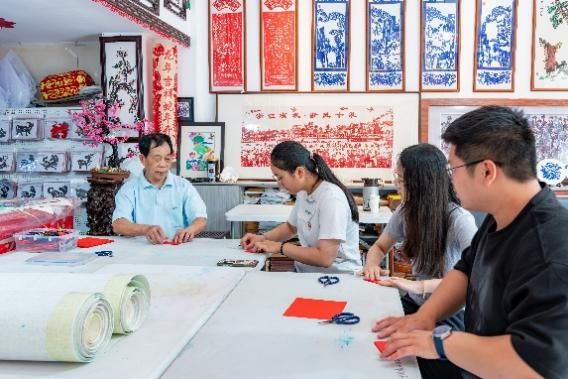 隨后,團隊來到象山風(fēng)情街,專程拜訪了剪紙藝術(shù)大師謝才華先生。在工作室,謝老動情分享了他的創(chuàng)作理念與公益實踐:“沒有文化的積淀,一個國家不可能真正發(fā)展下去”。他特別提到一幅耗時八個月構(gòu)思創(chuàng)作的巨作《象山山海萬象圖》,體現(xiàn)了其對家鄉(xiāng)的深厚情感。更令人敬佩的是謝老長期堅持公益?zhèn)鞒校瑘猿置客頌楫?dāng)?shù)匦W(xué)生義務(wù)授課。訪談中,他不僅傳授了剪紙藝術(shù)的精髓,更親手示范,指導(dǎo)調(diào)研成員剪出了五角星、小兔子等基礎(chǔ)圖案,讓大家親身感受到了大師的親和力與剪紙技藝的魅力。“親眼目睹大師風(fēng)采,親手體驗剪紙魅力,特別是了解到謝老數(shù)十年如一日義務(wù)教學(xué),這份對傳承的執(zhí)著和對下一代的關(guān)愛,讓我們深受感動和教育,”參與體驗的聞同學(xué)分享道。