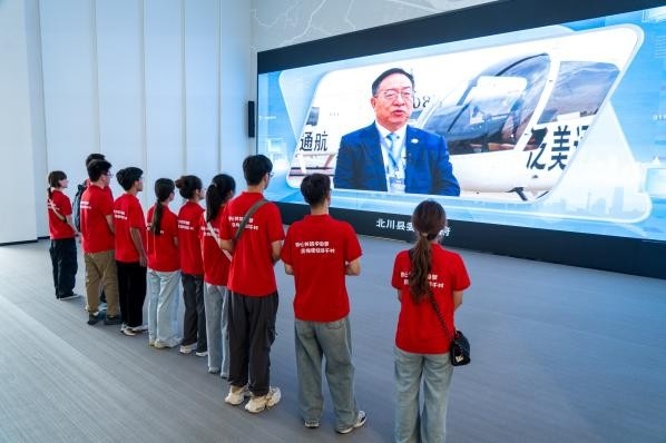 隨后,實踐隊轉訪北川通航展示中心。講解員由開場影片引入主題,從“新城崛起”板塊講起,詳細介紹了北川如何以永昌機場為支點,打造“天空之城”產業規劃,吸引航空培訓、飛機制造等企業入住。展區內,航空模型、地方特色“五個一”等各具特色的文創產品,推動文旅融合。