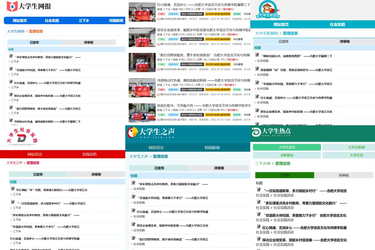 文傳助力振興,融媒奏響新聲團隊秉持以文化浸潤?quán)l(xiāng)土,用傳媒連接城鄉(xiāng)的理念,共計發(fā)布72篇新聞稿,向包河青年、裕安共青團等17個網(wǎng)站投稿,閱讀量達46795次。制作并發(fā)布了3條話題Vlog和4條創(chuàng)意視頻,收獲瀏覽量22721次。同時在總策劃張愛萍老師的指導(dǎo)下,制作了《情系裕安八載行:青春賦彩鄉(xiāng)村路》視頻,以多維傳播方式極大提高了合肥大學(xué)美譽度,傳播了鄉(xiāng)村振興新成果。