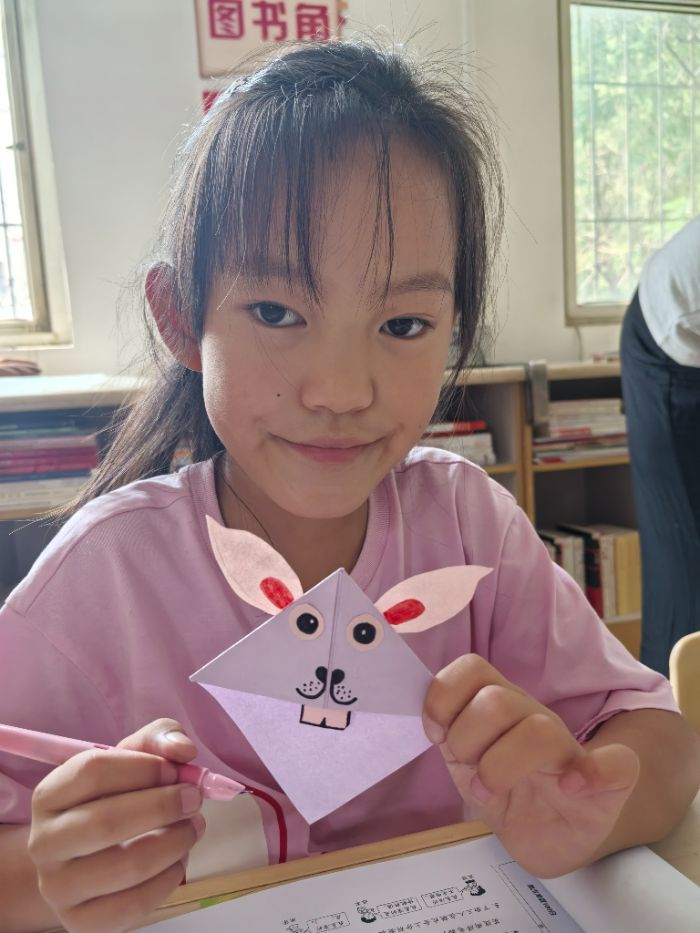 掌握基礎技法后,孩子們的創造力如同被點燃的火花。“老師,我想給小兔書簽加上標致的小兔牙!”一個小姑娘舉起半成品,彩紙被她巧妙地裝飾上兩顆兔牙,活脫脫一只愛吃的小兔子。受此啟發,其他孩子也紛紛開啟“腦洞模式”:有人將黃色卡紙折成圓滾滾的小黃人,用黑筆點上標志性的護目鏡;有人把長方形紙張折成小船;還有男孩折出尖尖機翼的飛機。