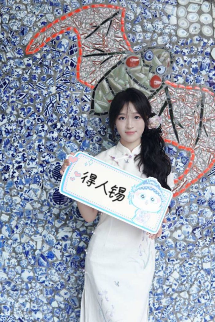 或在寓意吉祥的“五福臨門”蝙蝠墻飾前并肩而立,萌趣形象與傳統(tǒng)符號碰撞出火花;或于精品青花瓷展柜旁輕觸傳遞,指尖流淌的是青春脈搏與千年文化的生動共鳴;行走于“平步青云”的瓷石路上,隊員、埔娃娃與陶瓷意境同框,共同繪就傳統(tǒng)、潮流與青春力量和諧共生的畫卷。