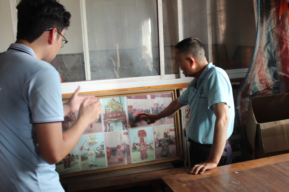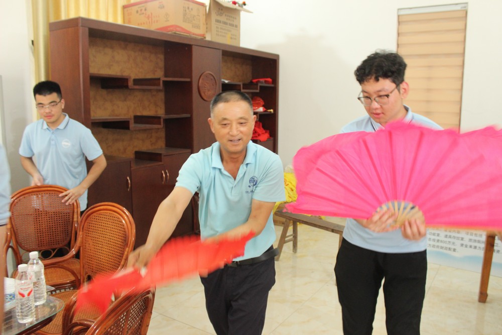 采訪中,周館長熱情地向?qū)嵺`團成員回溯五猖戲的歷史脈絡,講述自己與五猖戲相伴的歲月,每當提起這些,他眼角眉梢滿是笑意,自豪之情溢于言表。作為五猖戲第一人,周館長扮演了數(shù)十年“和尚”,哪怕已經(jīng)是退休的年紀,也仍扎根五猖戲傳承第一線。在現(xiàn)場,周館長還示范起五猖戲中“和尚”角色的動作:看似簡單的輕移金步、翻飛扇影,實際操作起來卻暗藏玄機,難以把控。團隊成員親身體驗后方知,所謂“臺上一分鐘,臺下十年功”,正是對這份技藝的生動詮釋。