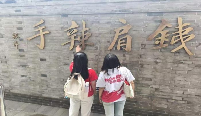圖8團(tuán)隊(duì)成員于磚墻前感受“鐵肩辣手”精神