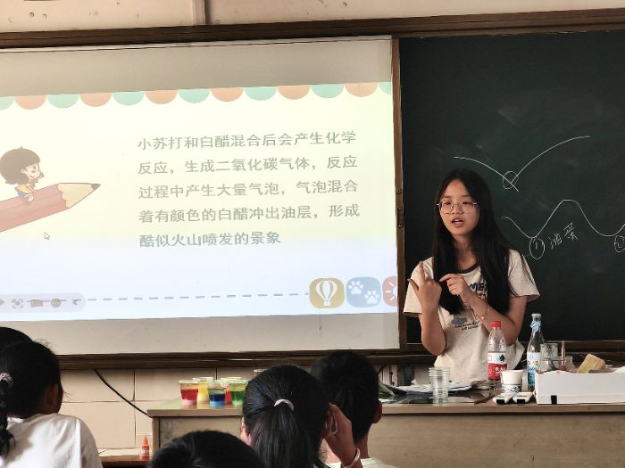 最后一節課以“海底火山爆發”和“彩虹泡泡龍”兩個趣味實驗為核心,帶領學生們探索科學奧秘。在“海底火山”實驗中,學生們通過小蘇打與白醋的反應,模擬了火山噴發的場景,并理解了密度與化學反應的原理。