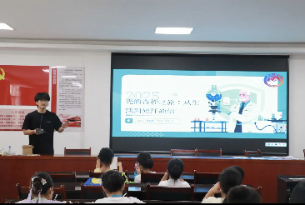 光學(xué)課堂上,團隊成員以生活中常見的光現(xiàn)象為切入點,從彩虹的形成講到影子的變化,再逐步深入到光纖通信的奧秘。他用生動的比喻將抽象的原理具象化,告訴孩子們 “光就像會跑的信使,能帶著信息傳到很遠的地方”,為孩子們打開了一扇通往光學(xué)世界的全新窗口,讓他們在好奇與驚嘆中感受科技的魅力。