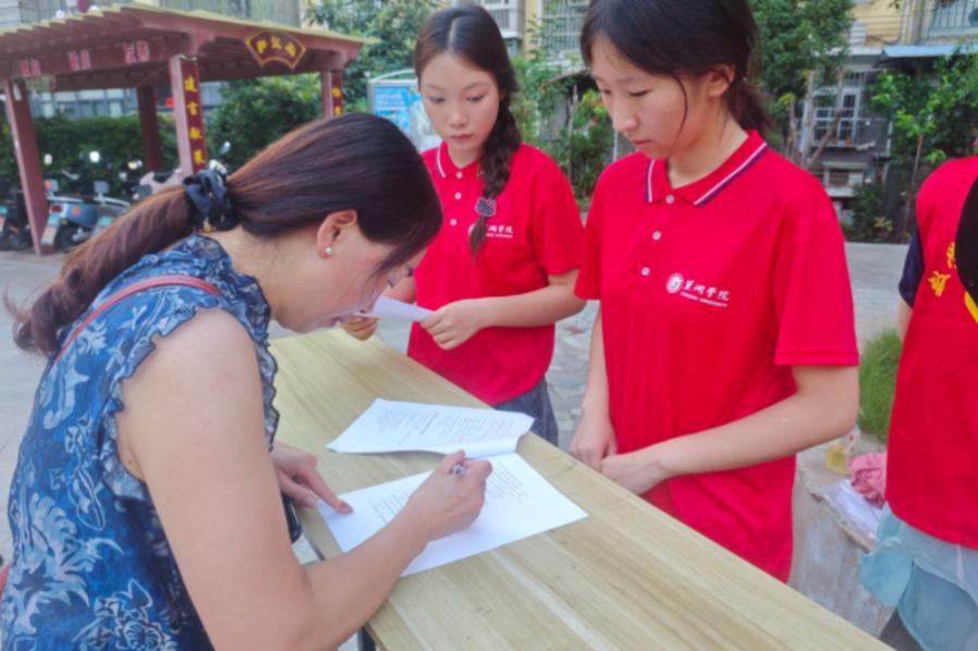 圖為實踐團(tuán)隊走進(jìn)官圩社區(qū)居委會發(fā)放線下問卷和宣傳單。陳路瑤 供圖
