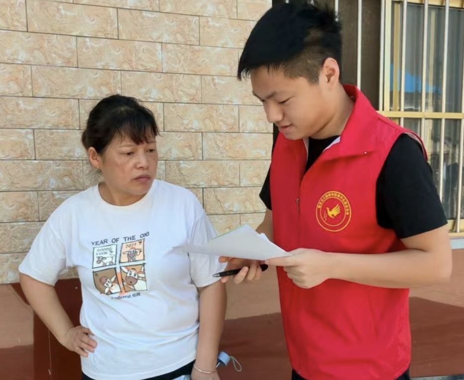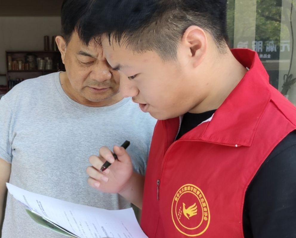 抵達同大鎮后,團隊成員迅速分組行動,帶著提前設計好的調查問卷,走向鎮內的集市、居民區和沿街商戶。無論是正在擺攤的商販,還是乘涼閑聊的居民,隊員們都主動上前,用熱情的招呼和耐心的引導,邀請大家參與問卷填寫。過程中,他們始終保持親和態度,遇到年長或視力不佳的居民,便逐題輕聲念讀,協助完成作答,讓每份問卷都承載著真實的想法與需求。