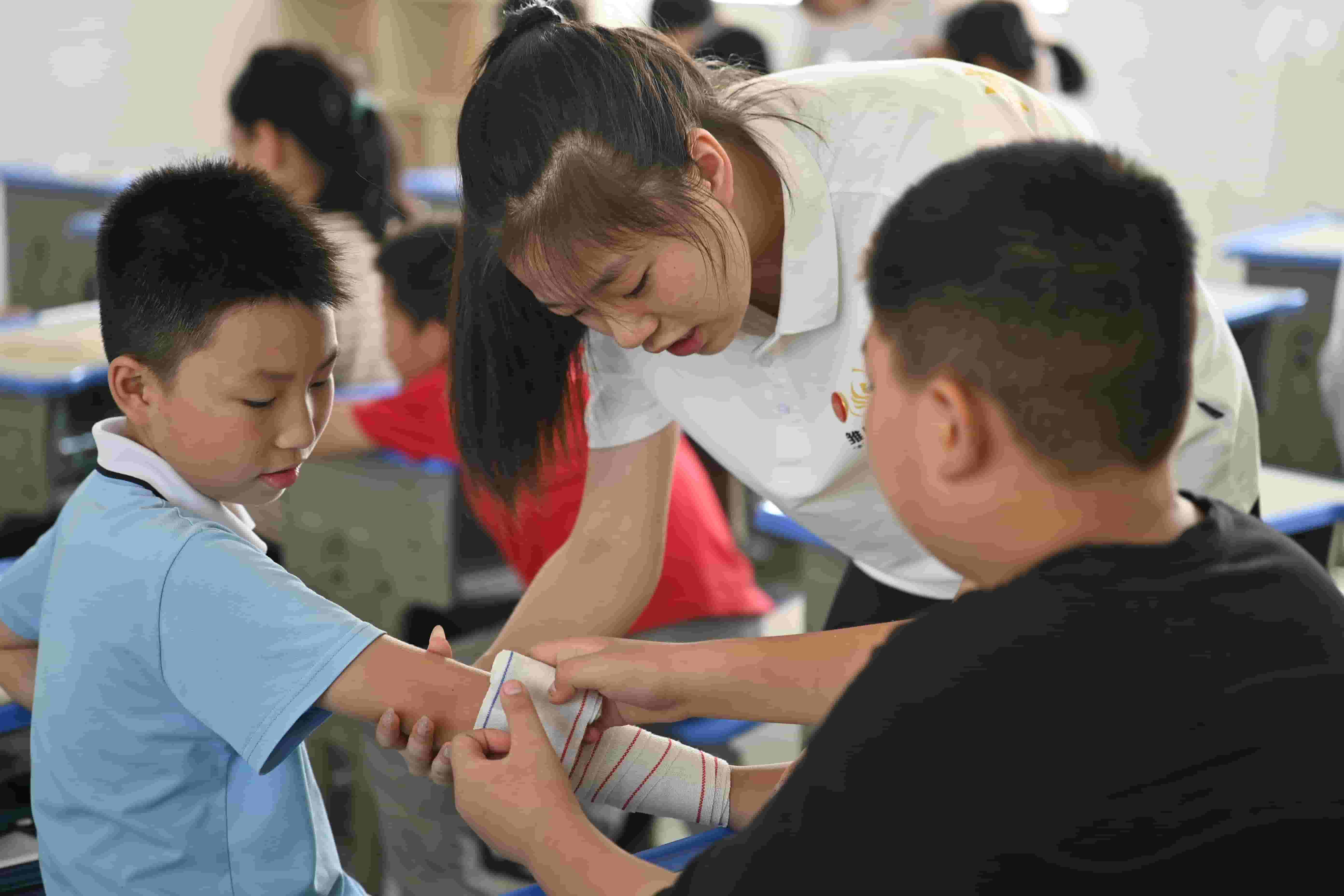 隊員王楹的醫(yī)學課上,白色的繃帶在孩子們手中流轉(zhuǎn)。她先在模型上演示,指尖翻飛間,繃帶便穩(wěn)穩(wěn)裹住"傷口","繞圈時要輕要勻,就像對待每一個需要呵護的生命"。那一圈圈纏繞的不僅是繃帶,更是"慎重"二字的分量——原來細微處的嚴謹,藏著對生命的尊重。
