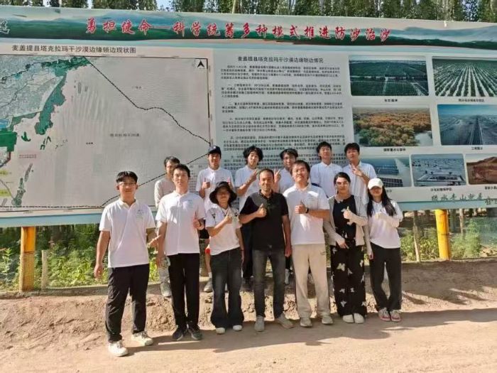 實踐團(tuán)抵達(dá)麥蓋提縣后,在當(dāng)?shù)靥峁┑膶S媒煌ūU舷虑巴死敻缮衬吘売^測點(diǎn)。在這里,實踐團(tuán)看到曾經(jīng)飽受流沙侵蝕、嚴(yán)重威脅周邊生產(chǎn)生活空間的區(qū)域,經(jīng)過長期治沙工程的持續(xù)推進(jìn),如今已構(gòu)建起多層固沙林帶,展現(xiàn)出 “林進(jìn)沙退” 的顯著成效,讓隊員們直觀感受到治沙工程的偉大力量。