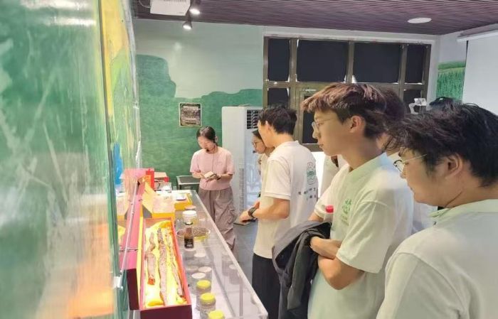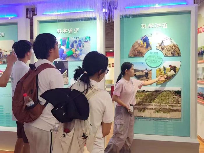 隨后,實踐團(tuán)走進(jìn)麥蓋提縣生態(tài)林展示館,在防沙治沙中心干部王姣姣的細(xì)致講解下,系統(tǒng)學(xué)習(xí)當(dāng)?shù)氐闹紊臣夹g(shù)體系與產(chǎn)業(yè)發(fā)展模式。在“生態(tài)林鎖邊”“工程治沙”等展區(qū),隊員們通過豐富的展板展示,深入了解到治沙人運(yùn)用網(wǎng)格固沙、飛播造林、節(jié)水灌溉等科學(xué)手段,實現(xiàn)流沙固定、植被恢復(fù)的技術(shù)路徑,對治沙技術(shù)的不斷創(chuàng)新與發(fā)展表示由衷的贊嘆。在梭梭、肉蓯蓉等沙生植物培育區(qū),實踐團(tuán)成員們探究了沙生植物從適應(yīng)沙漠環(huán)境的自然育種,經(jīng)過人工選育、技術(shù)賦能,轉(zhuǎn)化為兼具生態(tài)固沙功能與經(jīng)濟(jì)開發(fā)價值資源的全過程,深刻認(rèn)識到科技在治沙工作中的重要作用