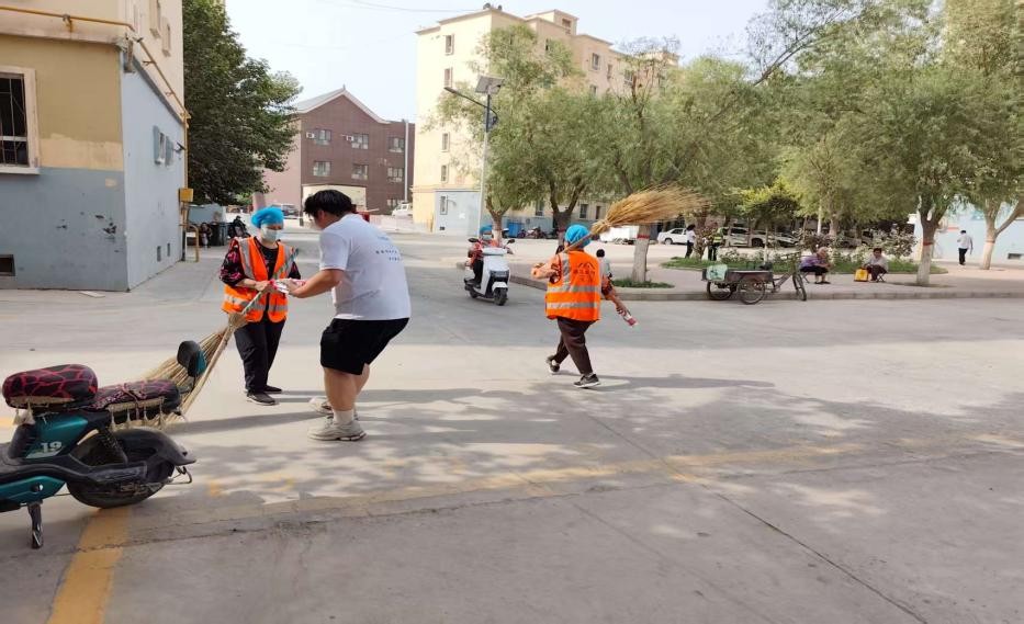 2025年7月9日上午10時,實踐團成員抵達刀郎小區北門,與小區物業經理圖妮薩古完成工作對接。圖妮薩古經理詳細介紹了小區及周邊環境衛生現狀,結合“共建清潔美麗家園”的環保理念,對清掃范圍、重點區域及環衛作業規范、安全注意事項進行了細致講解,為活動高效開展提供了清晰指引。