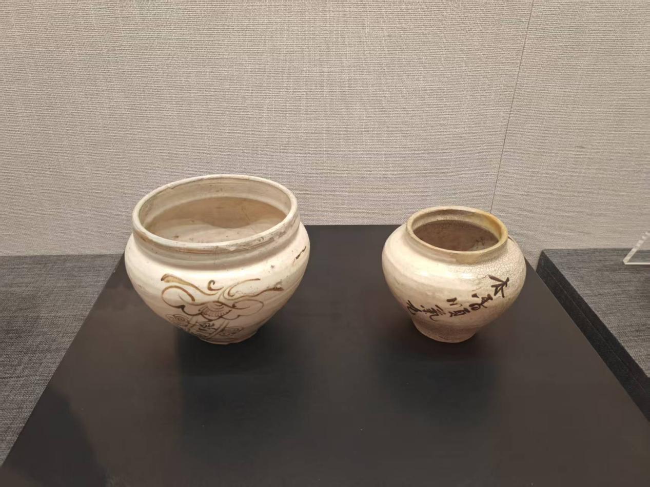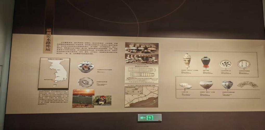 漳河·滏陽河外運圖,整面墻繪出磁州窯水路:漳河入衛運河,在天津出海;南下揚州,東去高麗、日本、北非。展柜里白地黑花“花白”文字碗、開光嬰戲紋罐,正是韓國新安沉船出水同款。我們把航線圖與瓷片并置拍攝,“小小瓷碗,當年也乘宋元巨輪遠渡重洋。”