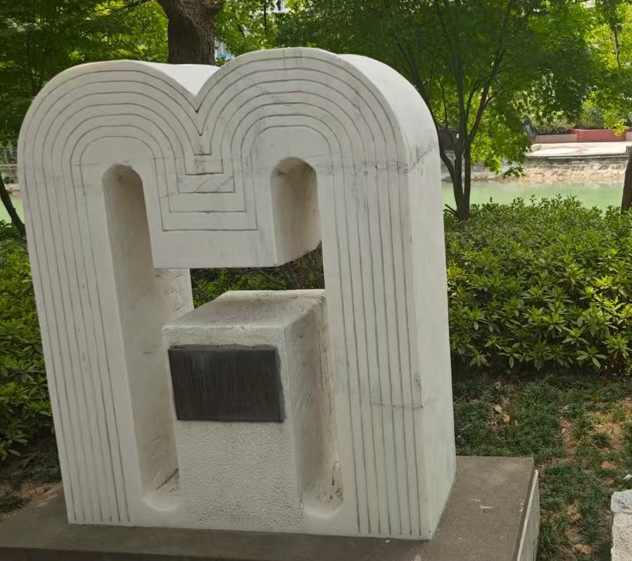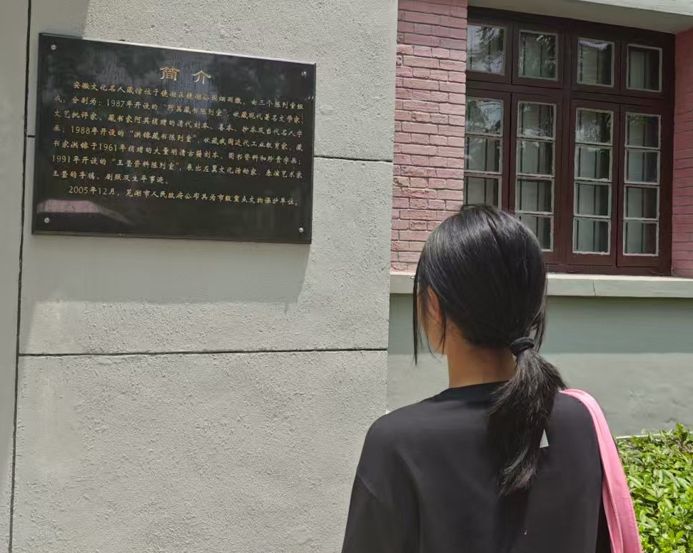7月20日上午,實踐隊員懷著對文化的敬畏之心來到了安徽文化名人藏館。步入藏館,首先映入眼簾的是洪镕捐書紀念基石。這塊紀念基石長約 1.2 米、寬 0.8 米,主體由漢白玉雕刻而成,造型如同翻開的書,中間鏤空處呈現“H”字樣,正面鐫刻著 “洪镕捐書紀念” 的字樣,象征著洪镕先生的藏書成就和對家鄉無私奉獻的情懷。根據記載,我們了解到1961年5月,洪镕將自己畢生珍藏的14000多冊古籍無償捐給家鄉蕪湖。