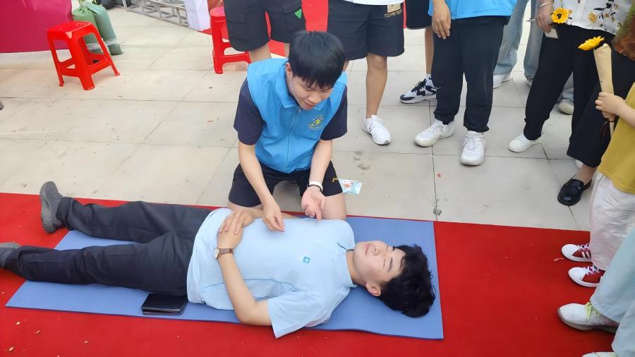 志愿者在鹽城市碧桂園天璽小區“龍蝦節”現場,設置模擬急救區,用情景短劇再現“有人突然倒地”的應急場景,吸引居民圍觀參與。