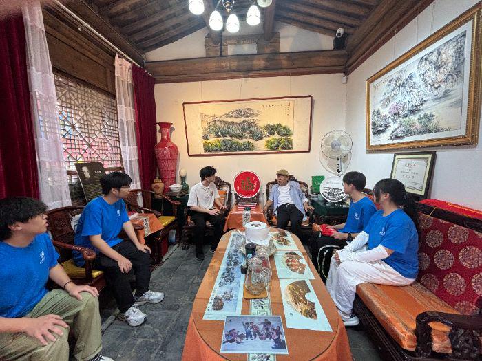 在參觀接近尾聲時,實踐隊有幸采訪到了張大師。大師衣著樸素,面容和藹,言語間透著謙和與真誠。他熱情地向隊員們介紹每一件作品的創作背景和靈感來源,分享他在藝術創作過程中的心得體會。他談到,自己出生于新中國建設初期,成長于改革開放的春風里,正是在黨的文藝政策指引下,他得以將傳統技藝與現代審美相結合,實現了藝術生命的綻放。上世紀80年代,他深受焦裕祿同志"親民愛民、艱苦奮斗"精神的感召,創作了《公仆本色》系列紅色石板畫。在創作紅色作品時,他通過平衡藝術表達和主題內涵傳遞之間的關系,來展現紅色主題作品中承載的厚重的歷史情感和時代精神,同時在保留傳統繪畫精髓的基礎上進行創新。他還鼓勵年輕人要勇于嘗試,敢于創新,在人生的道路上不斷追求卓越。通過與大師的深入對話,隊員們感受到了老一輩藝術家在藝術創作中展現出的創新精神、執著追求和對細節的極致把控。