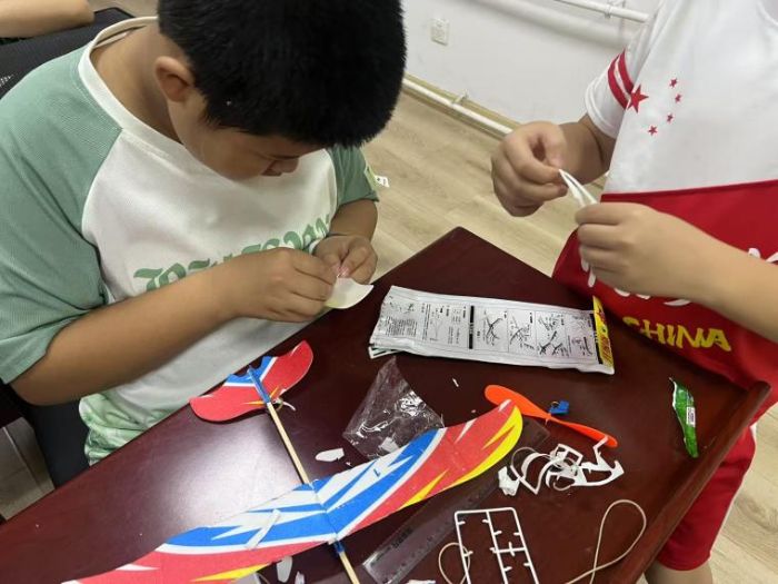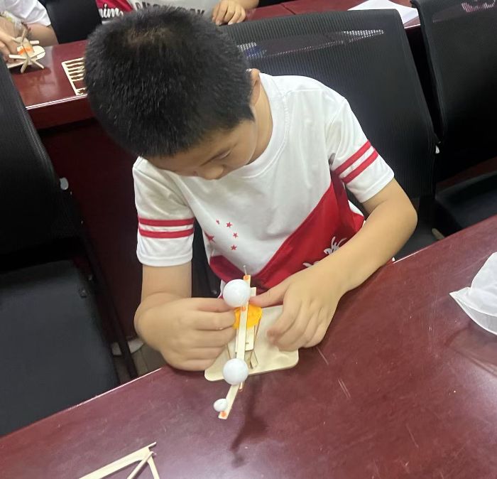 動手能力較強的孩子參與難度更高的項目。在迷你太陽能衛(wèi)星制作中,何柳邑講解光電轉(zhuǎn)換原理,指導孩子們用導線連接太陽能板與微型馬達。孩子們專注操作,成功后展現(xiàn)出顯著的成就感。當日地月三球儀模型制作小組討論軌道大小時,她引導觀察不同尺寸圓盤卡紙,演示公轉(zhuǎn)、自轉(zhuǎn)概念,幫助孩子們理解天體運行關系。簡易明輪船制作中,她示范橡皮筋動力原理,指導固定船軸、纏繞橡皮筋,孩子們通過試驗掌握基本機械原理。?