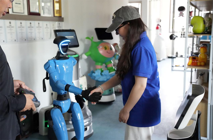 在余建指導下,成員們實操了宇樹機器人GO1、GO2及UnitreeH1等產品,見證機器人完成多方向行走、蹲起握手等動作。成員呂宛凌在體驗后說道,AI大模型支撐下的人形機器人“艾米”實現了無障礙語音交互,H1機器人的動作響應精準流暢,“這種人機協同能力預示著AI機器人將在服務、工業等場景釋放巨大潛力”。