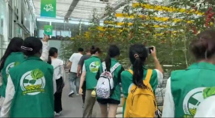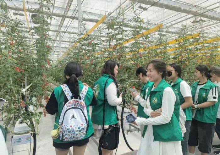 首先講解員帶領(lǐng)實(shí)踐隊(duì)走進(jìn)壽光標(biāo)準(zhǔn)化蔬菜大棚,這里堪稱“植物生長的智能工廠”。在技術(shù)人員的引導(dǎo)下,隊(duì)員們看到了大棚內(nèi)運(yùn)用物聯(lián)網(wǎng)系統(tǒng)精準(zhǔn)調(diào)控溫度、濕度、光照和CO?濃度,無土栽培、滴灌施肥等技術(shù)讓各類蔬菜長勢喜人的現(xiàn)象,這生動展現(xiàn)了科技如何讓傳統(tǒng)農(nóng)業(yè)煥發(fā)高效與優(yōu)質(zhì)的雙重活力。