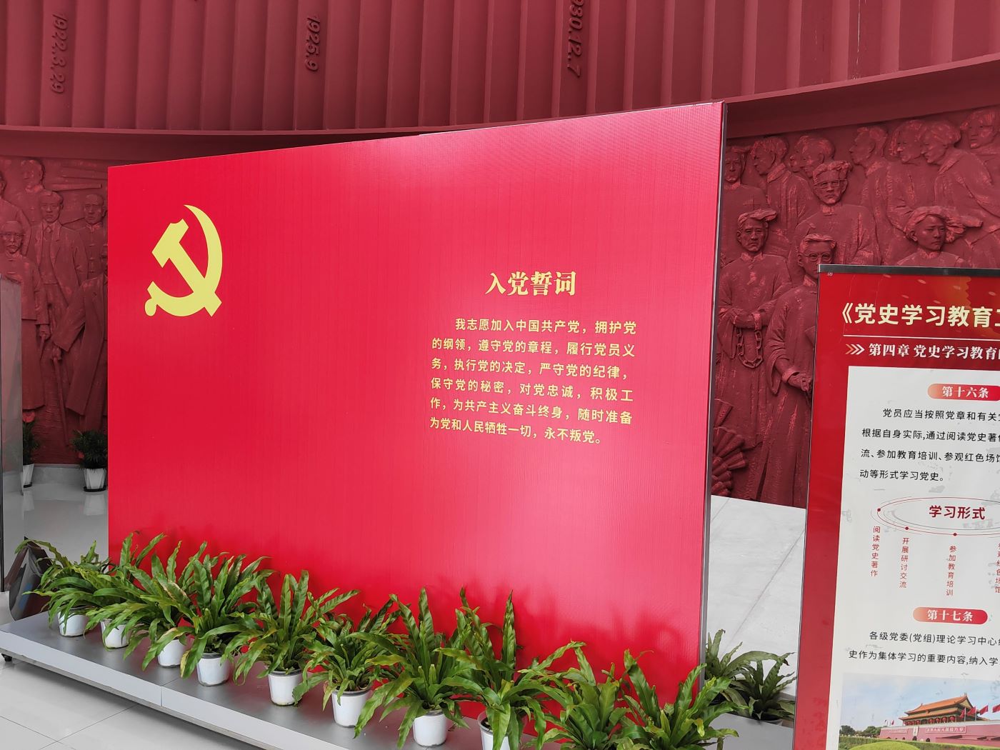 紀念館的出口處的大廳中間屹立這一塊紅色的入黨誓詞展板,莊嚴的鐮刀錘頭閃耀光芒,入黨誓詞如同一束熾熱的光,照亮信仰之路。“我志愿加入中國共產黨……” 這一句句誓言,是共產黨人對信仰的莊重承諾,承載著為黨和人民奉獻一切的決心。在宣誓的那一刻仿佛志愿者與革命先輩跨越了時空的界限,志愿者在革命先輩們面前莊嚴宣誓。