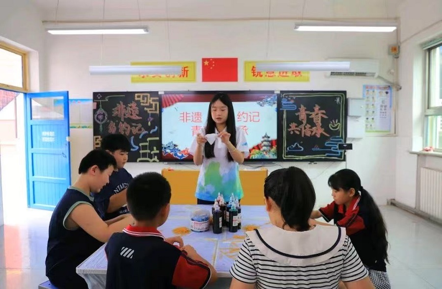 夏天的陽光灑在教室的窗欞上,扎染的藍、剪紙的紅、拓印的綠在孩子們手中流轉。為給鄉村兒童的暑期生活增添一抹傳統文化的色彩,質量檢測與管理系暑期社會實踐團成員帶著精心準備的非遺技藝走進鄉村,用"沉浸式非遺課堂"為孩子們編織了一個充滿東方美學的仲夏夜之夢,開啟一段傳統文化奇旅。