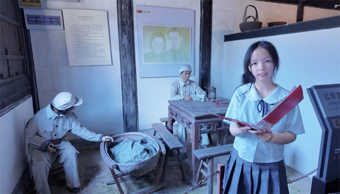 在浙東四明山抗日根據地舊址群,譚啟龍、何克希將軍展陳旁的泛黃文獻,藏著先輩對家人的牽掛;“魚水情”雕塑前,隊員們誦讀家書中“為萬民謀永福”的字句,廉政章程與家書里“清白做人”的囑托相映,讓“艱苦奮斗”具象可感。黨旗前,誓言融入家書中的信仰力量。