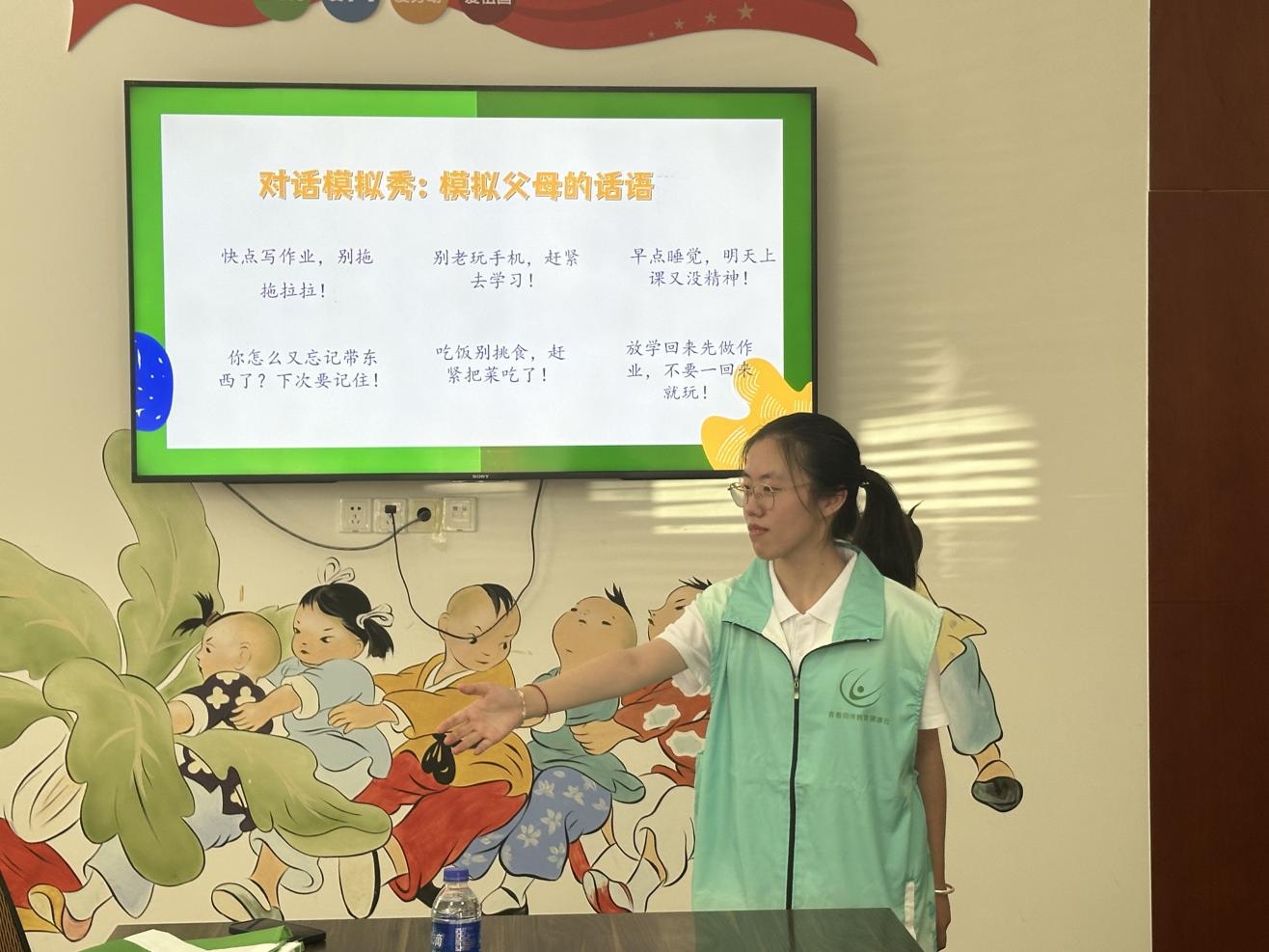 課堂無(wú)縫轉(zhuǎn)入親子關(guān)系主題。針對(duì)成長(zhǎng)中常見(jiàn)的溝通壁壘,志愿者精心設(shè)計(jì)互動(dòng)環(huán)節(jié)。在"角色互換"模擬環(huán)節(jié)中,孩子們戴上志愿者準(zhǔn)備的"家長(zhǎng)徽章",用稚嫩卻認(rèn)真的語(yǔ)氣模仿起父母的日常叮囑。"作業(yè)寫(xiě)完了才能看電視哦"、"多吃蔬菜才能長(zhǎng)高高",這些平日里聽(tīng)?wèi)T了的嘮叨,此刻從孩子們口中說(shuō)出,引得在場(chǎng)家長(zhǎng)會(huì)心一笑。一位扎著馬尾辮的小姑娘模仿得尤為傳神,她皺著眉頭,學(xué)著媽媽的口吻說(shuō):"都說(shuō)了多少次了,玩完玩具要收好!"話音剛落,自己先忍不住笑倒在椅子上。通過(guò)這樣生動(dòng)有趣的模擬,孩子們第一次真切地體會(huì)到,那些曾經(jīng)覺(jué)得"煩人"的管教話語(yǔ)背后,其實(shí)都藏著父母滿滿的關(guān)愛(ài)。