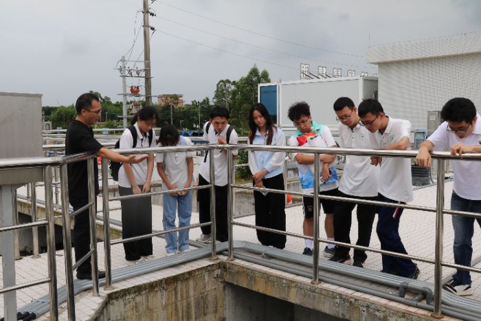 隨后,突擊隊前往恩平市潤遠環保有限公司城區污水處理廠與農村污水處理站參觀,在廠長何競超的介紹下,隊員們了解了污水處理的全部流程,對比分析了城區智能中央控制平臺的實時監測系統、龐大處理構筑物群的高效運轉和農村污水處理的特色運營模式,跨越“課堂理論”與“產業實踐”的鴻溝。同時,通過規范采集當地河道水樣,將河道原水與污水處理廠尾水比對分析,用科學數據評估治理成效,深化專業實踐,校地聯合破解“農村環境治理難”的困境。