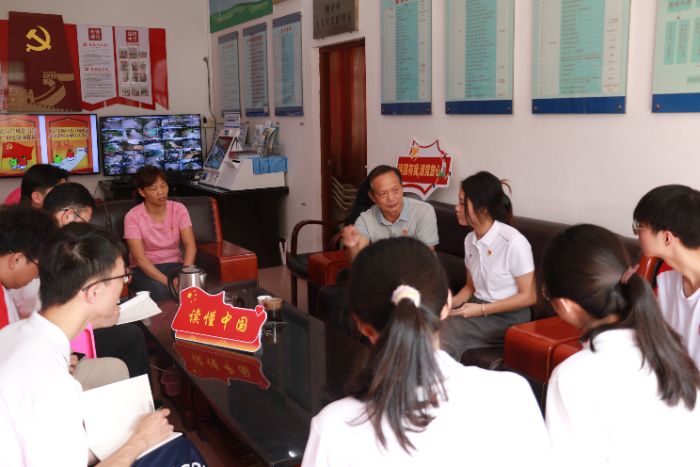 在圣堂鎮塘龍村黨群服務中心,突擊隊與村委會支部書記吳素霞交談,了解當地英雄事跡和革命精神,同時開展面對面“五老精神”對話活動,與“五老”代表——當地老教師、老校長、老黨員唐儒贊深入對話。唐儒贊始終牢記“為黨育人、為國育才”的初心使命,秉持“學高為師、身正為范”的教育理念。他以其近40年深耕基層教育的經歷囑托大學生們“堅守初心、勇于擔當”,讓隊員們深刻理解“五老精神”與鄉村振興的內在關聯,凝聚起“老中青”協同的力量。