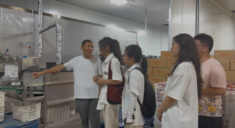 在車間內,隊員們看到南小王村的新鮮蔬菜經清洗、切割、滅菌后,變身預制菜,車間還有各種預制產品的生產設施,產品通過全國24個合作渠道外銷。“我們每年從村里收3000多噸菜,多數村民在這里工作。”公司負責人袁樸凱的介紹,讓隊員們實地見證了“農田到餐桌”的價值翻倍:一根黃瓜從地頭到車間,附加值提升2-3倍。