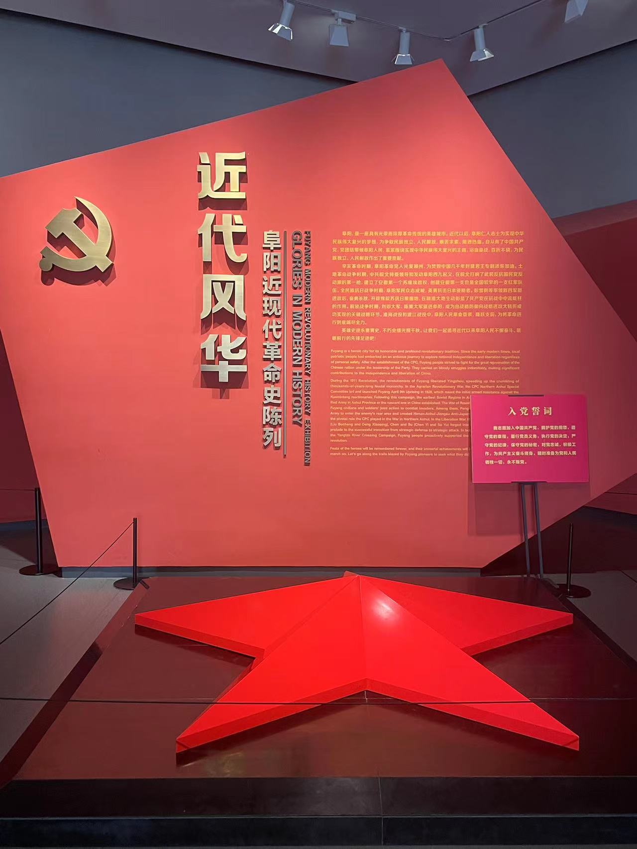 再上一層樓來至近現(xiàn)代革命史陳列,近代以后,阜陽的無數(shù)仁人志士為實(shí)現(xiàn)中華民族偉大復(fù)興的夢(mèng)想,艱苦求索,拋灑熱血。自從有了中國(guó)共產(chǎn)黨,黨團(tuán)結(jié)帶領(lǐng)阜陽人民,緊緊圍繞實(shí)現(xiàn)中華民族偉大復(fù)興的主題,浴血奮戰(zhàn),百折不撓。辛亥革命時(shí)期,阜陽革命黨人光復(fù)潁州;土地革命時(shí)期,中共皖北特委領(lǐng)導(dǎo)和發(fā)動(dòng)四九起義,創(chuàng)建安徽第一支紅軍隊(duì)伍;全民族抗日戰(zhàn)爭(zhēng)時(shí)期,阜陽軍民眾志成城,英勇抗擊日本侵略者;解放戰(zhàn)爭(zhēng)時(shí)期,劉鄧大軍、陳粟大軍挺進(jìn)阜陽,改為戰(zhàn)略進(jìn)攻的策略,在淮海戰(zhàn)役和渡江戰(zhàn)役中,阜陽人民簞食壺漿,踴躍支前,為革命進(jìn)行到底竭盡全力。彭雪楓等率領(lǐng)新四軍挺進(jìn)敵后,開辟豫皖蘇抗日根據(jù)地,在潁淮大地彰顯了共產(chǎn)黨在抗戰(zhàn)中中流砥柱的作用。英雄史跡永垂青史,不朽業(yè)績(jī)光照千秋,它是實(shí)現(xiàn)中華偉大復(fù)興的重要精神支撐。