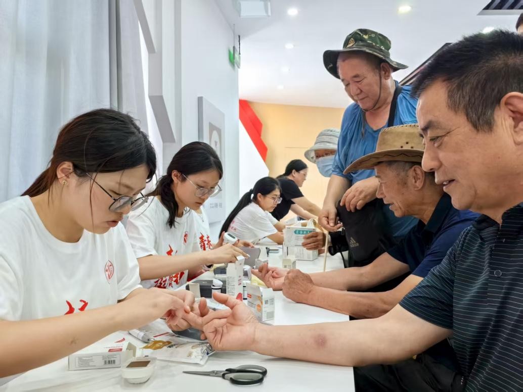 為幫助老年群體及時了解自身健康狀況,實踐團開展血壓、血糖免費檢測服務。活動現場,成員們細致為老人測量數據,運用專業知識解讀結果,在詢問健康狀況后,推薦并指導使用“江蘇數字農家書屋”中的相關資源,如《中老年養生指南》《慢性病自我管理》等電子書籍與聽書內容,鼓勵老人通過便捷閱讀獲取科學保健知識,將“治未病”融入日常生活。義診桌旁書香縈繞,健康關懷與閱讀滋養相得益彰,讓老人們倍感溫暖。