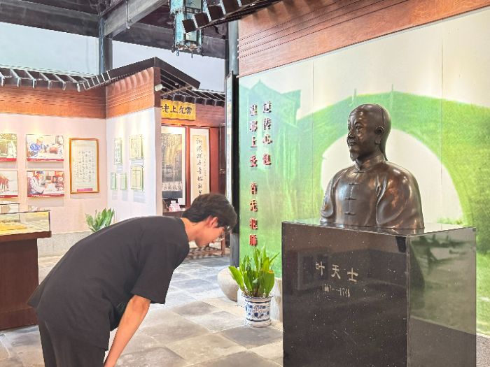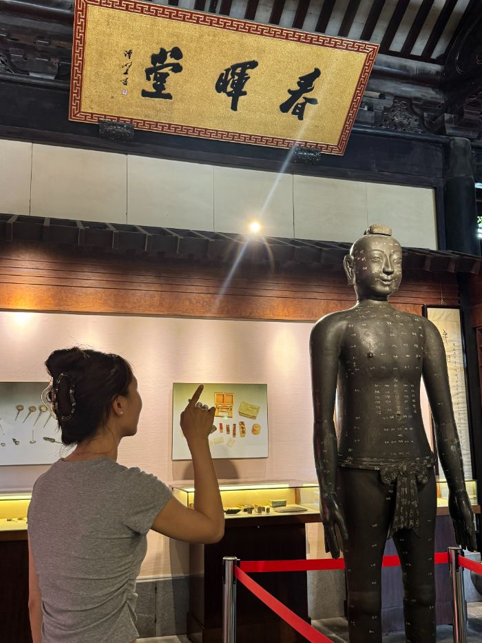步入古樸典雅的蘇式建筑,跨過青石地袱的高聳門檻,團隊成員首先來到第一展廳。在這里,大家系統回顧了中醫學的起源與發展脈絡,并有幸鑒賞到《儒門事親》等珍貴古籍的手抄真跡。隨后,團隊移步第二展廳。該展廳聚焦展示了吳醫的演進歷程:吳地早期醫學以道家思想為根基,至金元時期,在劉完素、張從正等醫家學術思想的影響下,逐步形成了獨具特色的“吳門醫派”。明清時期,吳中醫學迎來全盛發展階段,呈現出世醫傳承有序、儒醫群體崛起、醫學著作紛呈的繁榮景象,更孕育出了影響深遠的“溫病學派”。