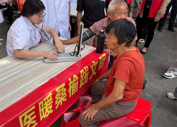 實踐隊隊員黃晶語為巴厝村村民進行血壓測量服務