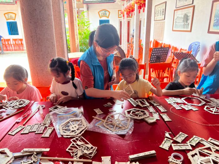 在廣東省潮州市,實(shí)踐團(tuán)成員結(jié)合當(dāng)?shù)孛袼组_展“花燈溢彩”活動(dòng),指導(dǎo)小朋友制作潮州花燈,傳遞了潮州花燈這一非遺技藝,更讓小朋友們對(duì)家鄉(xiāng)文化的熱愛在心中扎根。