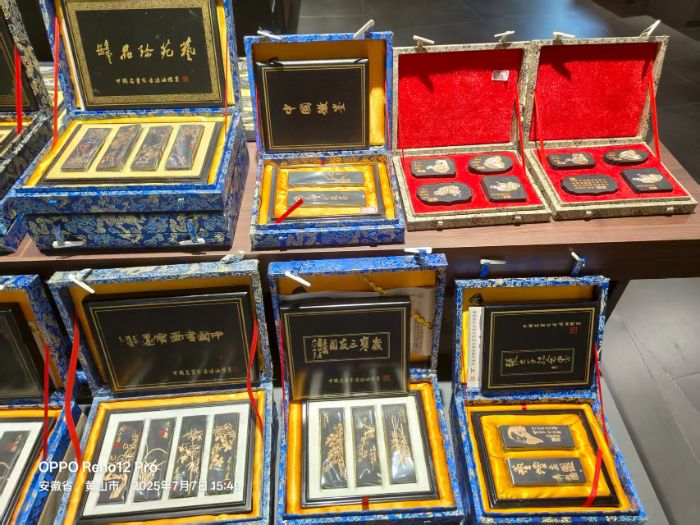 老師傅們手持細如發絲的毛筆,蘸取金粉,在素凈的墨錠上勾勒山水、花鳥、書法圖案。輕盈的筆觸精準落于方寸之間,原本質樸的墨錠瞬間因金色紋飾而煥發生機,冰冷的墨品仿佛被注入鮮活氣韻,盡顯“墨上添金”的雅致意境。一旁的歙硯制作區,匠人正打磨石材,硯臺的紋理在光影中流轉,與徽墨的烏黑形成巧妙呼應,展現著徽州非遺“剛柔并濟”的特質。