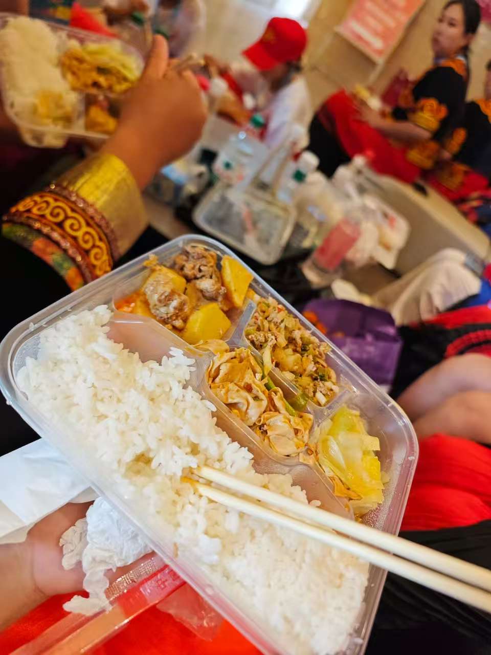 正午時(shí)分的服務(wù)間隙,一組抓拍于休息區(qū)的照片令人動容:志愿者們坐在簡易折疊椅上,手捧冒著熱氣的盒飯,有的還在核對流程表,有的互相分享服務(wù)趣聞。后勤組組長王志強(qiáng)介紹:"我們聯(lián)合本地餐飲協(xié)會,開發(fā)了兼顧營養(yǎng)與口味的'火把節(jié)特供餐',每餐保證兩葷兩素和彝族特色蕎餅。"照片中正在吃飯的醫(yī)護(hù)志愿者劉醫(yī)生笑著說:"雖然比不上家里飯菜,但吃到熱乎的酸菜土豆湯特別暖心。"這些樸實(shí)的用餐場景,成為記錄志愿者服務(wù)的溫情注腳。