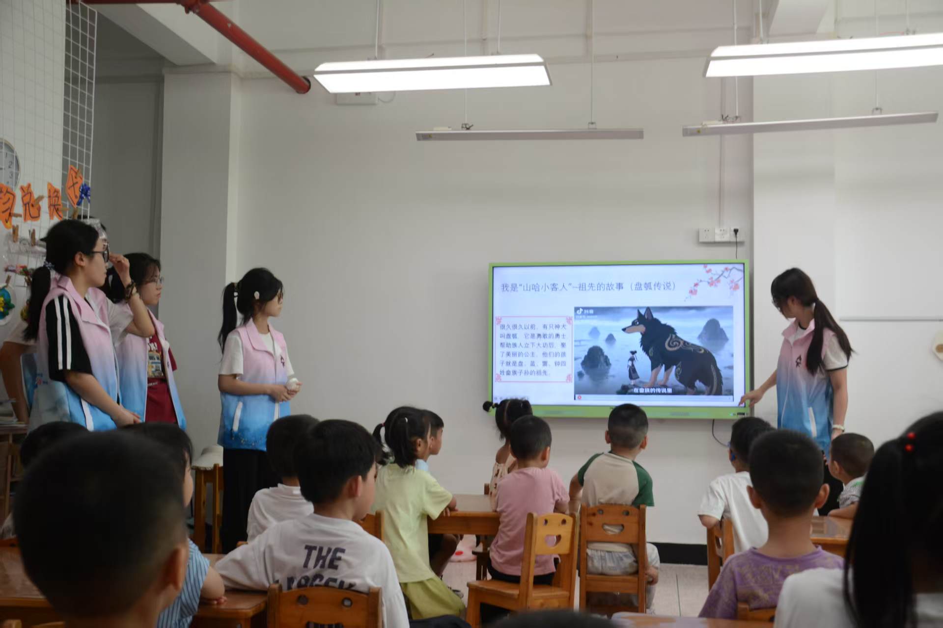 圖為新“韓”路實(shí)踐團(tuán)成員給幼兒園孩子講畬族文化。黃悅涵 攝