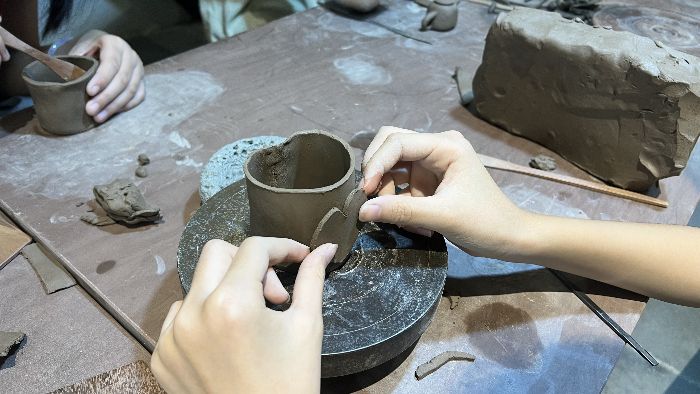 圖為志愿者教授制陶技藝 姚雨欣供圖