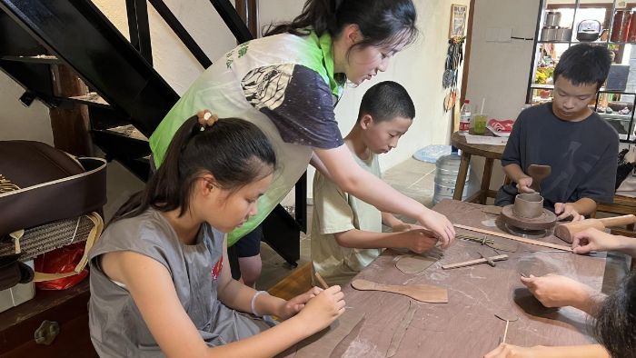 7月15日,我們以寓教于樂的方式,帶領(lǐng)同學(xué)們親手制作紫砂壺,感受紫砂文化的獨特魅力,在指尖揉捏間播撒文化傳承的種子。專業(yè)人員現(xiàn)場示范了揉泥與拍打的規(guī)范手法,重點講解了去除氣泡、增強泥料韌性的關(guān)鍵步驟。我們帶著小朋友們一起動手實踐。他們認真地揉搓、拍打泥料,通過親身體驗,直觀感受紫砂泥特有的柔韌性與可塑性。操作過程中,大家都興趣盎然。當指尖真正觸到紫砂泥的那一刻,我才懂得什么是泥土的呼吸。在我們的手掌下,泥團仿佛被賦予了生命,反復(fù)揉搓、拍打間,筋骨漸成。