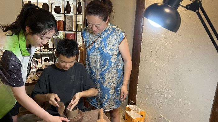 7月15日,我們轉場丁蜀鎮古南街,開啟紫砂非遺探秘之旅。青石板路蜿蜒,紫砂壺的韻律在空氣中流淌。我提前聯系紫砂非遺傳承人丁女士,為孩子們準備了紫砂泥與工具?;顒又?,我給小朋友們展示了各種類型的紫砂壺,講述紫砂從礦石到藝術品的蛻變。在制作環節,我悄然蹲下,與孩子們并肩,與非遺傳承人一起耐心指導他們“拍打泥片、塑造身筒”。面對一個小男孩因泥料干裂而顯露出的失落,我遞上一塊濕潤的毛巾,溫言細語:“紫砂需歷經千錘百煉,千度烈火方能成器,正如我們面對挑戰,決不輕言放棄。”最終,孩子們捧著歪歪扭扭卻獨一無二的“處女作”,臉上洋溢著自豪。這一刻,我忽然明白:文化傳承的種子,正是在這樣笨拙卻真誠的觸摸中悄然萌芽。